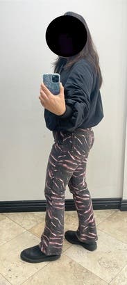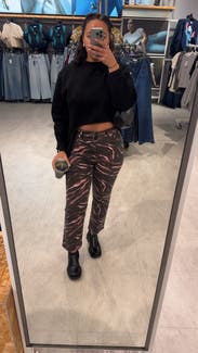 The print is so fun, and the length is perfect for a pair of Chelsea boots. Small in the waist with very little give.
