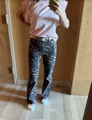 A lot of reviews mention the stiffness these jeans. I did receive these NWT and while they were stiff at first, as I continued to wear them I could tell that they would break in nicely. I don’t find them to be uncomfortable at all, but I am very used to 100% cotton denim and prefer how it wears over time compared to most stretch denim. This is a fantastic pair for petites as well since there’s no weird knee breaks or anything. TTS for Ganni (fit very similarly to the leopard pair from spring 2025), which is a size up from what I took in the Rollas wide leg jeans in the grommets.