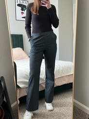 Loved these so much I bought them. I got a 6, which is my usual size in bottoms - they’re super flattering, and I love the cute details like the one slanted back pocket and the slits at the bottom of each pant leg. Really chic and elongating.
