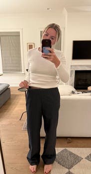 I loved these trousers- I sized up for a low rise relaxed look and found the style very flattering on me. The material is light but still good quality. Subtle pinstripe patterning is very very chic. Definitely long on my (styled like a puddle jean with heels) but used fashion tape to faux hem during the day.