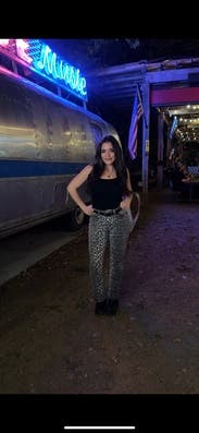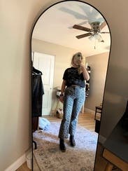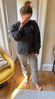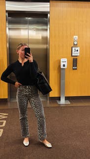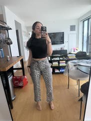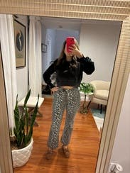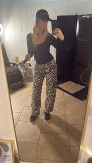 I’ve seen leopard pants more frequently and these didn’t disappoint. They are long! At 5’11 they graze the ground. Fun fit, small barrel style in the leg for shape. 10/10
