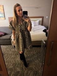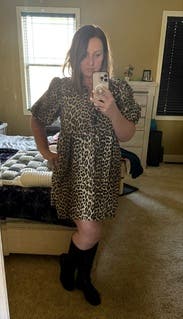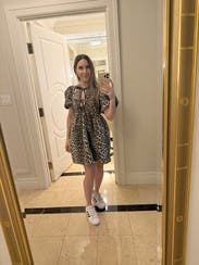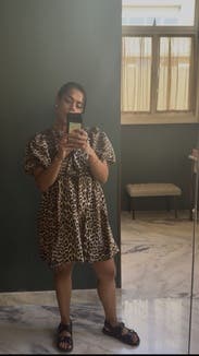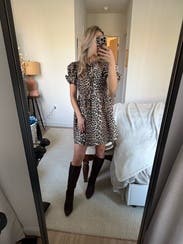 The animal-print dress with puff sleeves is playful and trendy without being over the top. The short length keeps it breezy for warm weather. Definitely a statement piece and could elevate it for dinner or an evening outing by swapping sneakers with strappy sandals and adding gold jewelry.