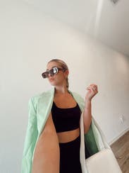 Totally loved wearing this and wore it multiple times. Looks great with jeans, bodycon dresses, and even biker shorts. First off, the shade is like an almost fluorescent pistachio. It's a really unique color and it's bold (not pastel). Secondly, it is an oversized loose fit. Take your usual size and expect for it to fit boxy and exaggerated. It has shoulder pads, so just go for all the drama with this one.