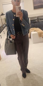 On a positive note the fabric is soft & comfortable, and the color is great for Fall/Winter. This is my 2nd pants rental from this brand and both ran large. Even with 4” heels, these were 4” too long. This brand really needs to make pants for petites if they’re going to make the regular length so long. One would need to be at least 5’7” to wear these.