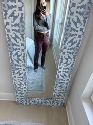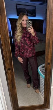 These were the perfect fit, and made my waist look small and fit my hips and butt nicely! Lots of compliments! The color says red but they’re definitely a very dark maroon, so I thought a black top was not the best choice. Would have looked better with an off white top. I have long legs and the length was perfect with a low heel.
