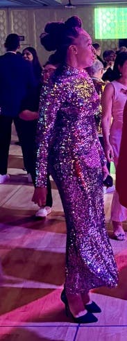Wore to a podcast live show (Lady Gang!) where the theme was prom/sparkles/glitter and this dress was EVERYTHING. It has a mock neck that I did unzip to the base of my neck by the end of the night, but otherwise this dress is so so comfy and was so flattering. I got zillions of compliments, including from Becca, Jac, and Keltie. I drank, sat, ate, and danced in this dress and stayed comfortable!