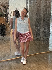 I was stopped walking into the restaurant for a date by the hostess and she told me I look like early augts Britney! I am very tall and have a curvy bottom but this still fit and was comfortable even being micro short. Also the lining is very comfortable so no scratchy sequin issues. I loved styling this with an oversized dress shirt for contrast.