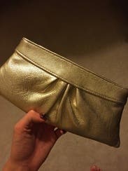 I loved this bag so much, I hated to send it back. I took it with me to an out of town wedding and it was perfect for every outfit - from fancy floral dress to my LBD, to skinny jeans and a cream silk top and black jacket - just gorgeous. It is a lovely shade of muted gold, not overly shiny. It was a little smaller that I thought it was going to be and only fits the basics - lipgloss, credit card and phone.
