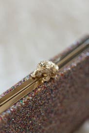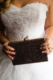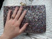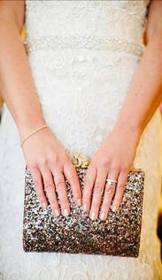 I rented this clutch for a wedding. It held all the essentials I needed for the entire day, except for my iPhone (which is in an Otterbox and quite bulky). Very happy to report that the glitter did not shed! Paired beautifully with the BCBGMaxazria 'Cross My Heart' gown.