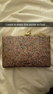 This was my first time using RTR and it was a great experience! I saw this little Kate Spade and thought it would match shoes I wanted to wear to a fundraiser. I wore with my Kate Spade backless bow dress. I could carry my phone, lipstick, lip gloss, compact with mirror and a box of mints. I tucked in the gold chain- it is long and smooth- won't snag fabric- I was a little afraid the sparkles may end up all over me or snag the dress but it didn't. Did not want to return!