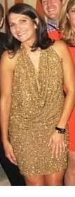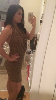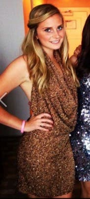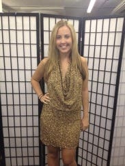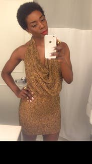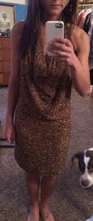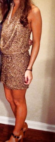 This is the perfect girl's night our dress! I loved the gold sequins and draped front halter. Because of the halter you do need to wear either a NuBra or you could wear no bra. This dress has a ton of room at the bust, so it is great if you are larger chested. It hit about 3-4 inches above my knee and had no stretch.