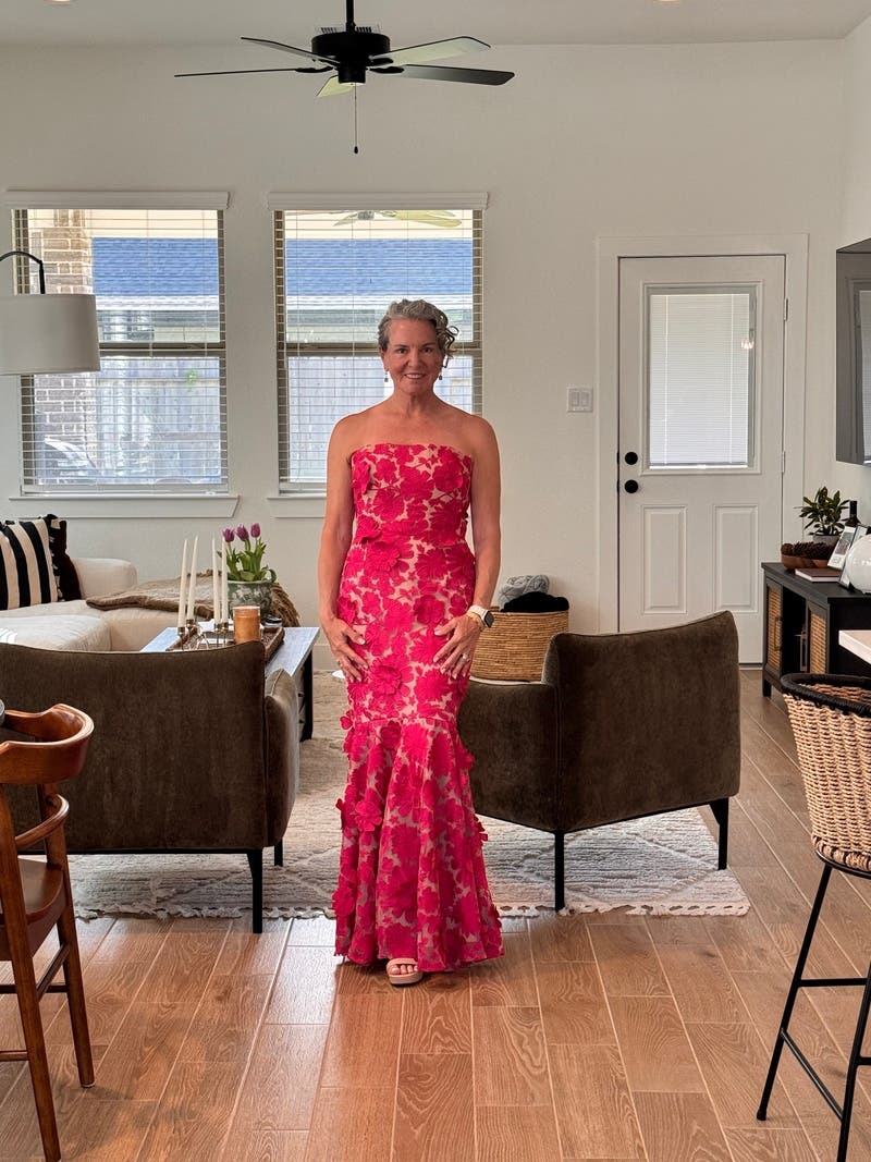 Pink floral (100% Polyester). Category: Gown. Strapless. Sleeveless. Side Zipper Closure. Shoulder to Hemline Length: 58". Imported.