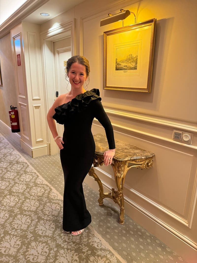 Black bandage (90% Recycled Rayon, 9% Nylon, 1% Spandex). Column. Long sleeve. One shoulder. Side zipper closure. 51.5" from shoulder to hemline. 21" slit. Imported.
