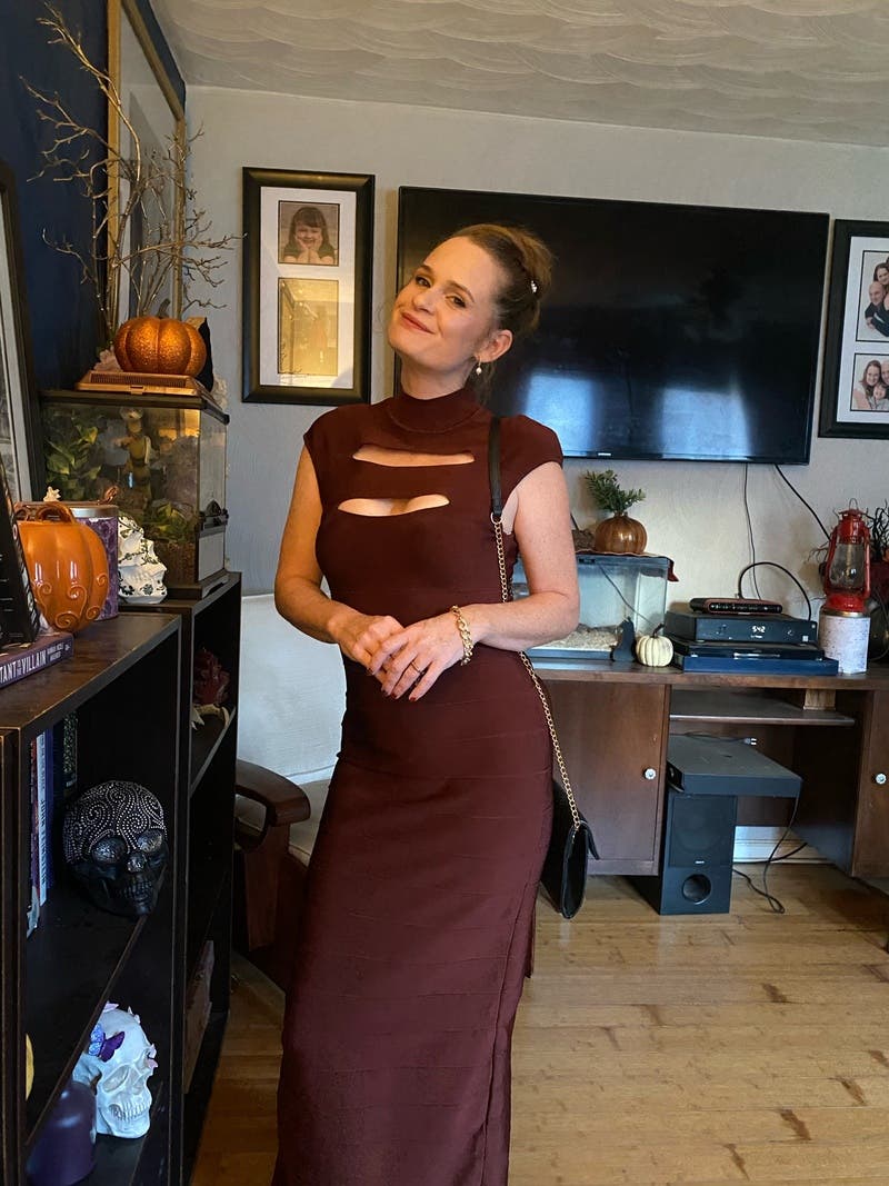 Perfectly placed cutouts put a sexy spin on this mock neck maxi gown by Hervé Léger. Let this bodycon gown shine at your next formal event with sky-high heels and a statement bracelet.