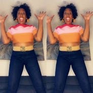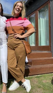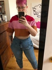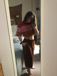 This top is colorful and fun and definitely has a place in the world— just not mine. I thought this would be a relatively long crop based on the model photo, but once you apply boobs to the equation you're looking at a VERY short shirt. I wore a contrasting color longline bralette underneath so that when I moved my arms it would look intentional that my bra showed, but when I say moved my arms I mean at all. Forward, backward, up even enough to grab my glass off the table, bra was out. The sleeve cut was also weirdly restrictive but again, I think this is related to the top not being designed to work around a relatively gifted chest. Overall I bet this would be really fun if you're rocking something less than DDDs, but for the big-chested, beware.