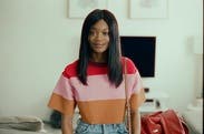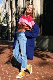 The photo on the model made it look to me like this was made of regular sweatshirt material, but it's actually a heavy version of the brand's signature banding, so it lays really nicely. In person the colors are even brighter.