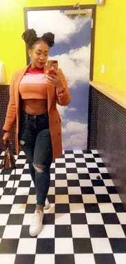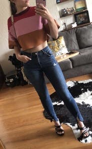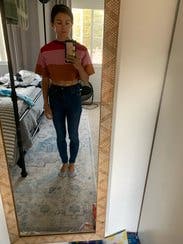 Really boxy fit bit with high rise jeans it's. A real sexy look. If you size up the top will be long enough that you don't need to show stomach