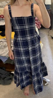 Blue plaid cotton (100% Cotton). Maxi. Sleeveless. Square neck. Pull on. 54" from shoulder to hemline. Imported.