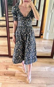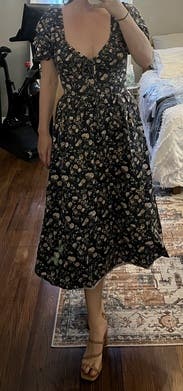 I love the fit of this dress! It is so flattering on the figure and very sweet. Yes it’s low cut but I don’t have tons of cleavage so I didn’t think it looked inappropriate on me at all. The one thing I don’t love about it is the way that the elastic on the sleeves rides up as you wear it, but it’s not a dealbreaker. This Hillhouse dress does run small so size up. I’m so glad only the medium was available because otherwise I would’ve gotten the small and it would’ve been tight! I went ahead and bought two of these dresses from Hill house because I just love the style, but the print on this particular one wasn’t my favorite.