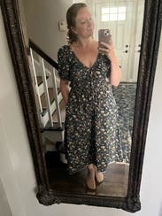 This dress is so pretty and has a flattering fit. I loved it so much that I bought it. Perfect to dress up for dinner or to wear to church, bridal or baby shower, etc