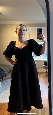 This dress is incredible - larger than life, (and for any coat I owned!) I loved it - it’s very fashion forward and the skirt has its full own personality. Felt amazing in this, and got tons of compliments. Wore to a corporate holiday party and a friend’s private birthday dinner, loved it. Similar to other Hofmann Copenhagen dresses though, the empire waist can be a pain to get over my bust but once you’re in, it’s perfect!