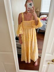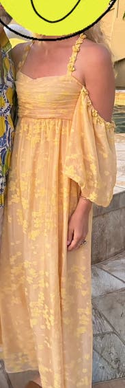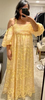 Absolutely beautiful special occasion dress. Got the only size available which was one size too big for me, but I had been waiting on this dress to become available so I snagged what I could get! Honestly, it’s prettier in person :) would be beautiful for a vacation, baby shower, summer wedding!