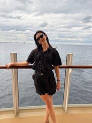 I wore the shirt tucked in and tucked out and loved both — a great comfortable set for vacation! The gold buttons were such a nice detail, I was sad to give this one back.
