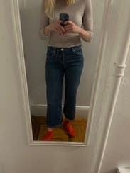 I adore these jeans and wear them constantly. They have a comfy stretch, flattering flare, and perfect midrise.
