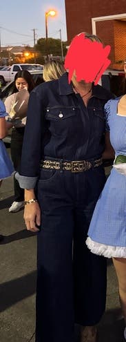 This denim jumpsuit is the perfect color. It fit just right. I’m typically a 30 in jeans and that’s the size I got. It was a little cumbersome to deal with when going to the restroom. But, I’d rent it again.