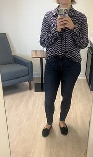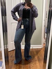 I loved this top so much, I bought it. Has a little more weight to it so it’s perfect for the cooler months. Wore it tucked in and loose fitting. Paired it with a jacket and a purple lame, mock turtleneck, a denim skirt, black slacks, and flare leg jeans. It offers many, fun looks.