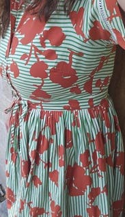 I loved the style and vibrant colors of this dress. It was very flattering on my 4th trimester body where my boobs are at least 2 cup sizes larger than normal and I have a flabby belly. I am normally a small but the medium fit me best. The buttons covered my top half very well - just right. There are 2 hidden buttons under the tie strap right at the waist and I had to safety pin that area because the buttons weren’t strong enough. Would rent again.