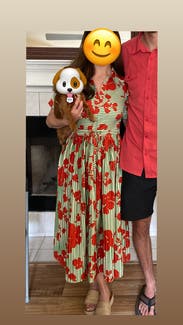 Rented this for a chill and casual Christmas lunch. The dress is lightweight and is giving 50s housewife vibes. Loved that it felt like Christmas without a full holiday print. Lightweight fabric and allows for movement for cooking relaxing at home. Big fan of this brand because of the casual comfort. Following the reviews I’m a small but it was unavailable. I rented the medium and very glad I did. The chest was a perfect fit. If I size down, I’m sure I’d be stretching the buttons.
