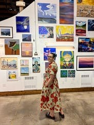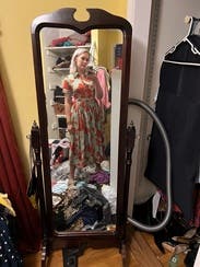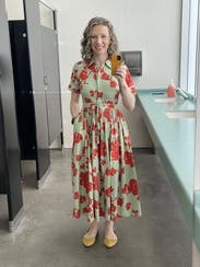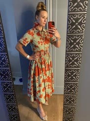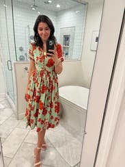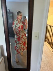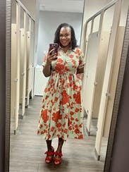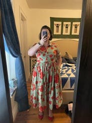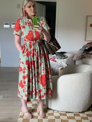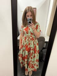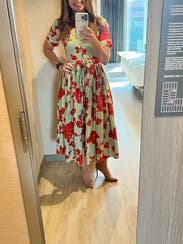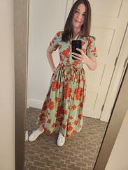 I wish I had a photo wearing it. I may still buy it. It's my perfect dress. Classic silhouette, perfect for multiple occasions (work, dinner, church), AND unique print/color combo that works across all seasons. Not to mention comfy and functional (pockets!). Highly recommend renting this.
