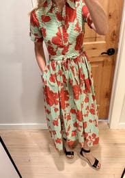 I wore this to an interview and photo shoot with our newspaper, as well as to the TED conference. Both called for something creative, fun, and comfortable, and this delivered. The top was slightly snug- I had to pin the bust. The skirt has a tie waist that is flexible. The hips are open. There are deep pockets, and the length was midi. The fabric is a light cotton. It did wrinkle, but the pattern hid it well. I steamed it before both wears. This was funky, flattering and functional- would probably rent again.