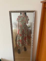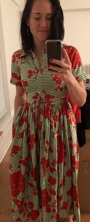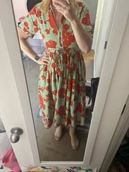 I love the color and print of this dress, got compliments just walking down the street. It unfortunately is comically small in the bust. I had to pin myself into this dress. Also has these interesting snaps on the waist part which kept popping open. Such a shame because it’s such a great dress!