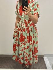 I love this dress - the colors and stripe/floral print are really unique. Fit was perfect and I like that the skirt has tiny pleats instead of just being full and swingy.