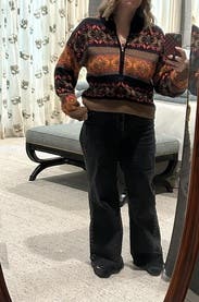 Easy, warm, maybe a little itchy, short. I like the zipper front. I didn’t end up styling it today but could def see it looking cute with a button up/fake collar underneath to dress it up a bit. The colors are as beautiful as they appear.