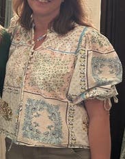 * Petite review * 5’2 113 lbs usually wear a XS so tts - this too is rocking the Western trend! I tied a double knot with the long ties to keep them under control. Loved the puffy sleeves and easy on the eyes pattern. This top is made of MID-WEIGHT fabric… I feel likely best worn with high waisted bottoms. I tucked my blouse into a pair of Rome shorts by the designer Cezane. Love this French designer - not on RTR. Wearing the top shopping with girlfriends then lunch afterwards. This top might be a bit too whimsical for the office but definitely could be pulled off with a blazer over it. 10/10 for me. No downside to this sweet number.