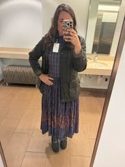 Brighter colors in person- nice fit in the chest and arms. Paired with a belt and boots- very flattering in the arms and waist.