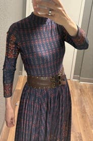 Elegant dress with gorgeous print. Worked best for my long torso belted and with knee high boots.
