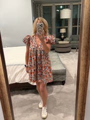 At first I felt like this might look too juvenile when I put it on, but I changed my mind. It’s so cute! The fabric is crisp and medium weight, so it hangs nicely. Feels expensive. The puff sleeves, pockets and cheerful floral print make this so easy to wear! It is a tent or swing shape, boxy but TTS.