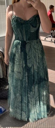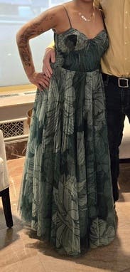 This is the dress! It's a lot of dress bc of the tulle underneath. It's a gorgeous green with pleats. I highly suggest renting for a special occasion.