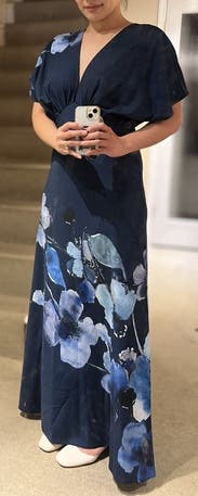This was super flattering! There is a deep V in the front, so not bra friendly, but could easily pin it or use tape to close it a bit more. I love the arm coverage as someone who does not love to show their arms. Ws also the perfect length on my 5 ft frame! Would be great for a mother of the bride moment or a winter/early spring wedding!