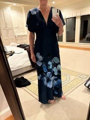 Blue floral (100% Polyester). Gowns. V-neck. Short sleeve. Side zipper closure. See fit notes for more information. Imported.
