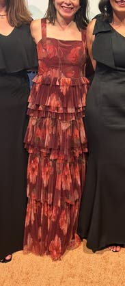 One of my favorite rentals! Wore this to my best friend’s wedding. The colors are gorgeous for fall. So many compliments, very flattering and fit like a glove. Did not need a bra or shape wear so very comfortable. The tulle is very fluffy but gave it a fun element without being too much