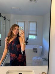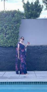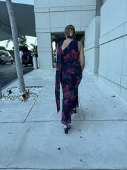 This was gorgeous on! The color and pattern were so pretty and it fit so well: snug in the right areas but really comfortable . The neck scarf was a fun detail too! Wore to a rehearsal dinner and got so many compliments. I want to buy it! I’m between a 4 and 6 and I think the 4 was great. This was the only picture I got but the length went to my ankles