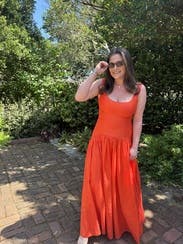This vibrant orange maxi dress by Hutch features a fitted bodice and a flowing skirt, with a playful yet elegant charm. Accentuate its simplicity with minimalist jewelry and strappy heels for a chic, summery look.