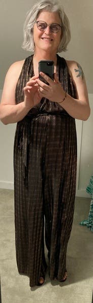 This was a super fun jumpsuit to wear to a wedding. You can dress it up or down as needed. I'd def not recommend this for a small bust or those on the shorter side. It has a lot of room on the top and 4 inch heels were needed for to not trip on the pant leg! Had a blast wearing it, one of the most comfortable things!