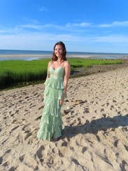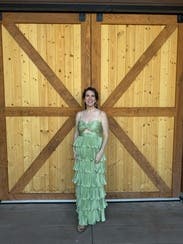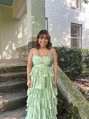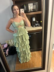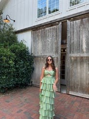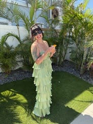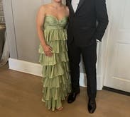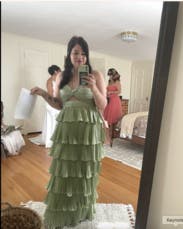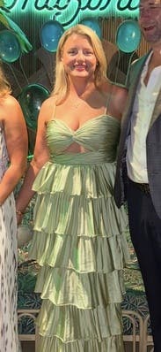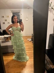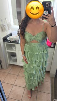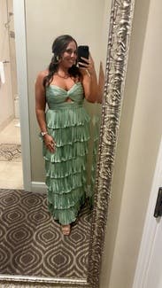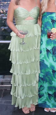 Shiny silky green layered dress! Not too long and lots of compliments. Rent me!