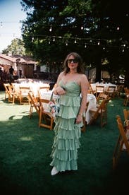 This dress was the perfect choice for a fun outdoor wedding in Palm Springs. So much so that another guest had the exact same dress! No matter, I loved the fun ruffles and was shaking it on the dance floor all night. Thank you for making Petite length dresses!! The length was ideal to wear with sensible heel. I was worried about the hips being too snug after reading other reviews but it was not an issue for me. Yes it was fitted around the hips but I put on some shapewear and if it looked too snug you couldn’t tell thanks to the ruffles. Honestly was super comfortable and flattering and I even sized down to the 4P. Straps held up fine, so good that by the end of the night I lifted my arms too high and popped one of them off! Had to have a friend tie it into a knot. But that was probably more because I was a dance-floor diva than any fault of the dress. Would 100% recommend - she’s as fun and frilly as she looks!